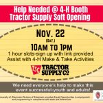 Help needed at the 4-H booth at Tractor Supply for their soft opening on November 22, 2025. 1 hour slots. Sign up here. Assist with 4-H Make & Take activities.