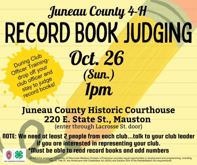 NOTE: We need at least 2 people from each club…talk to your club leader if you are interested in representing your club. Must be able to read record books and add numbers.