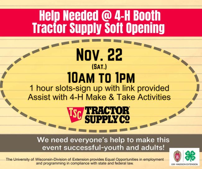 Help needed at the 4-H booth at Tractor Supply for their soft opening on November 22, 2025. 1 hour slots. Sign up here. Assist with 4-H Make & Take activities.
