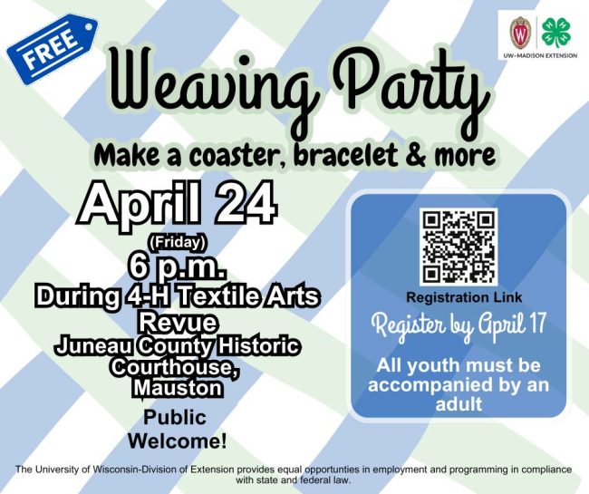The Weaving Party is open to everyone – you do not need to be enrolled in Clothing and you do not need to be entered in the Textile Arts Revue to participate! It will be held during 4-H Textile Arts Revue at the Juneau County Historic Courthouse. The Weaving Party is open to the public and it is FREE!