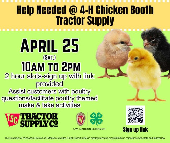 4-H members we need your help! April 25 (Saturday) we will have a 4-H Chicken booth at Tractor Supply, 10:00 a.m. to 2:00 p.m. 2-Hour slots are available. Sign up here or with the sign up link below. Assist customers with poultry questions/facilitate poultry themed make & take activities.