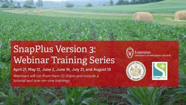 Extension, DATCP, and the SnapPlus Team will walk through new features in SnapPlus Version 3 to help farmers fill out their nutrient management plans. Each of the six webinars will cover a different topic. You can attend all sessions, or the most relevant to you, and each one includes time for one-on-one Q&A with staff.